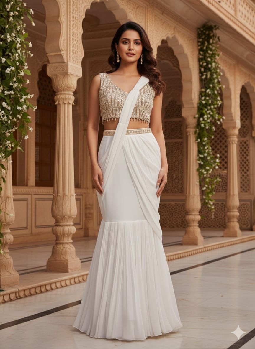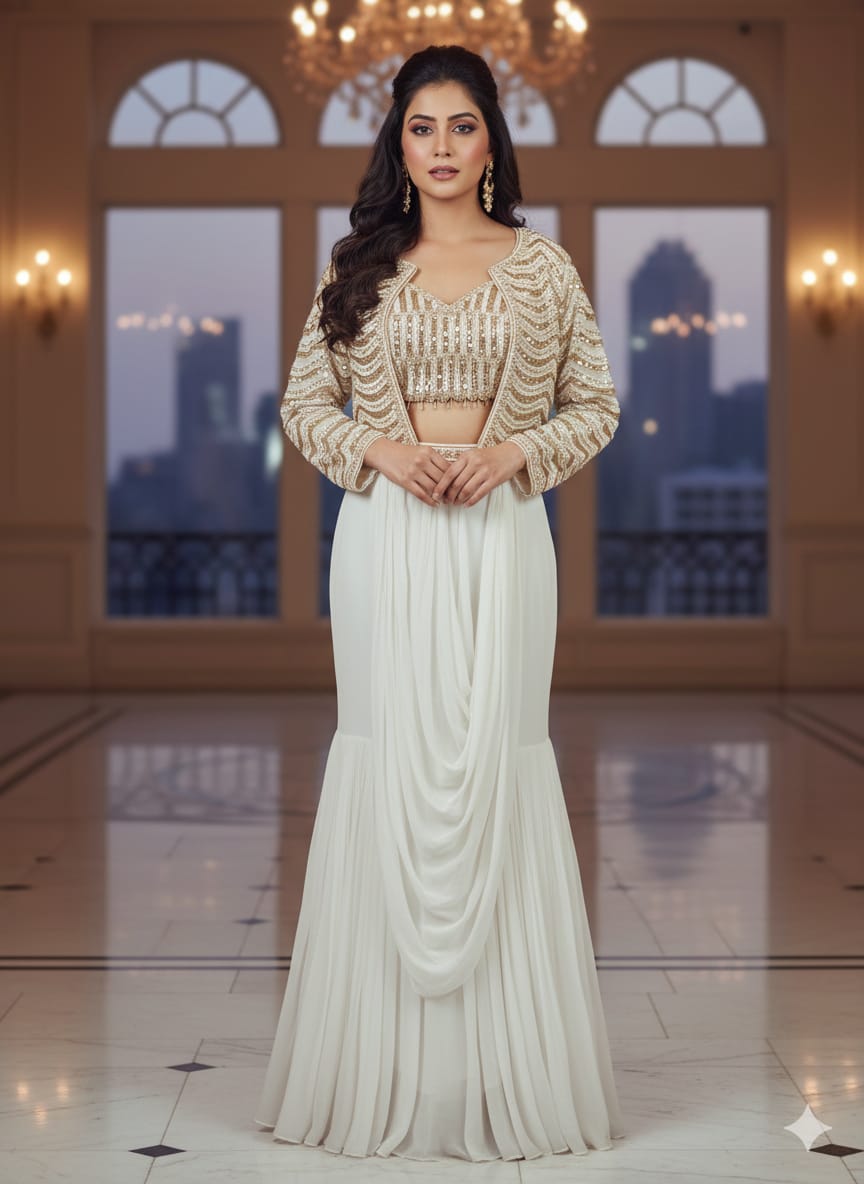 Modernize your wardrobe with our Indowestern (G01Q9) dress. This white drape dress features beautiful golden embroidery, making it a sophisticated choice for any occasion. Elevate your style and stand out with this unique blend of traditional and western design. Perfect for those who want to make a statement.