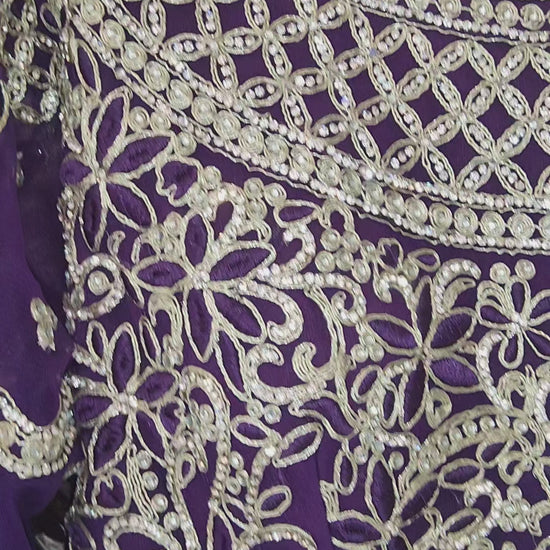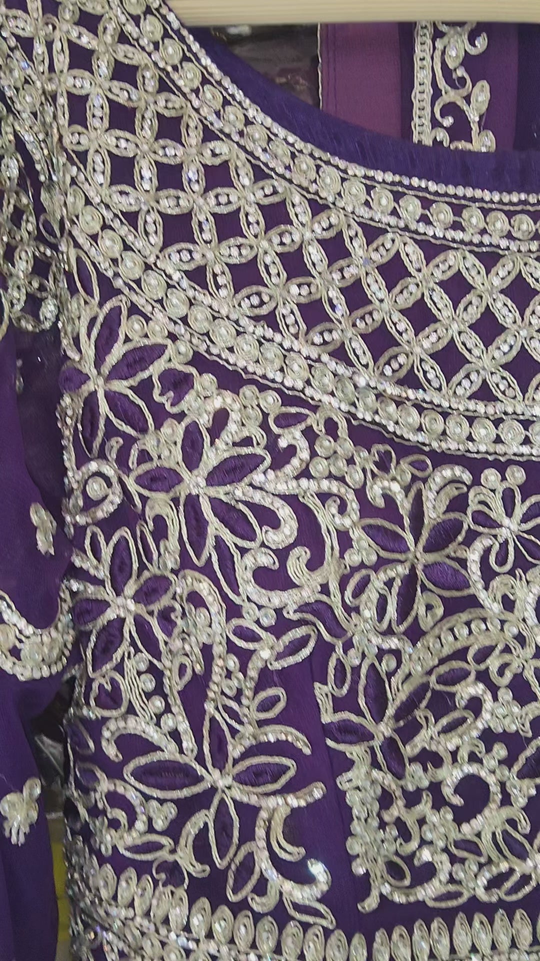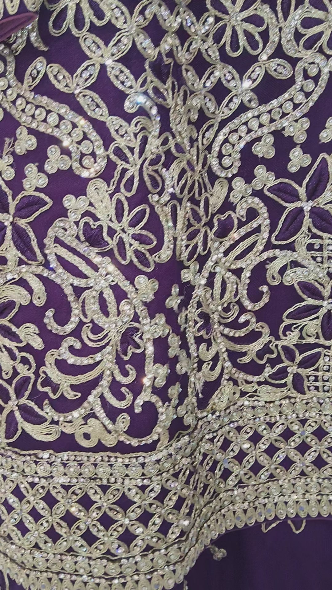 This Pakistani Sharara suit is truly a masterpiece with its heavy hand embroidery and elegant purple color. Made from high-quality net fabric, it offers both style and comfort. Perfect for any special occasion, this suit is a must-have for fashion-forward individuals.