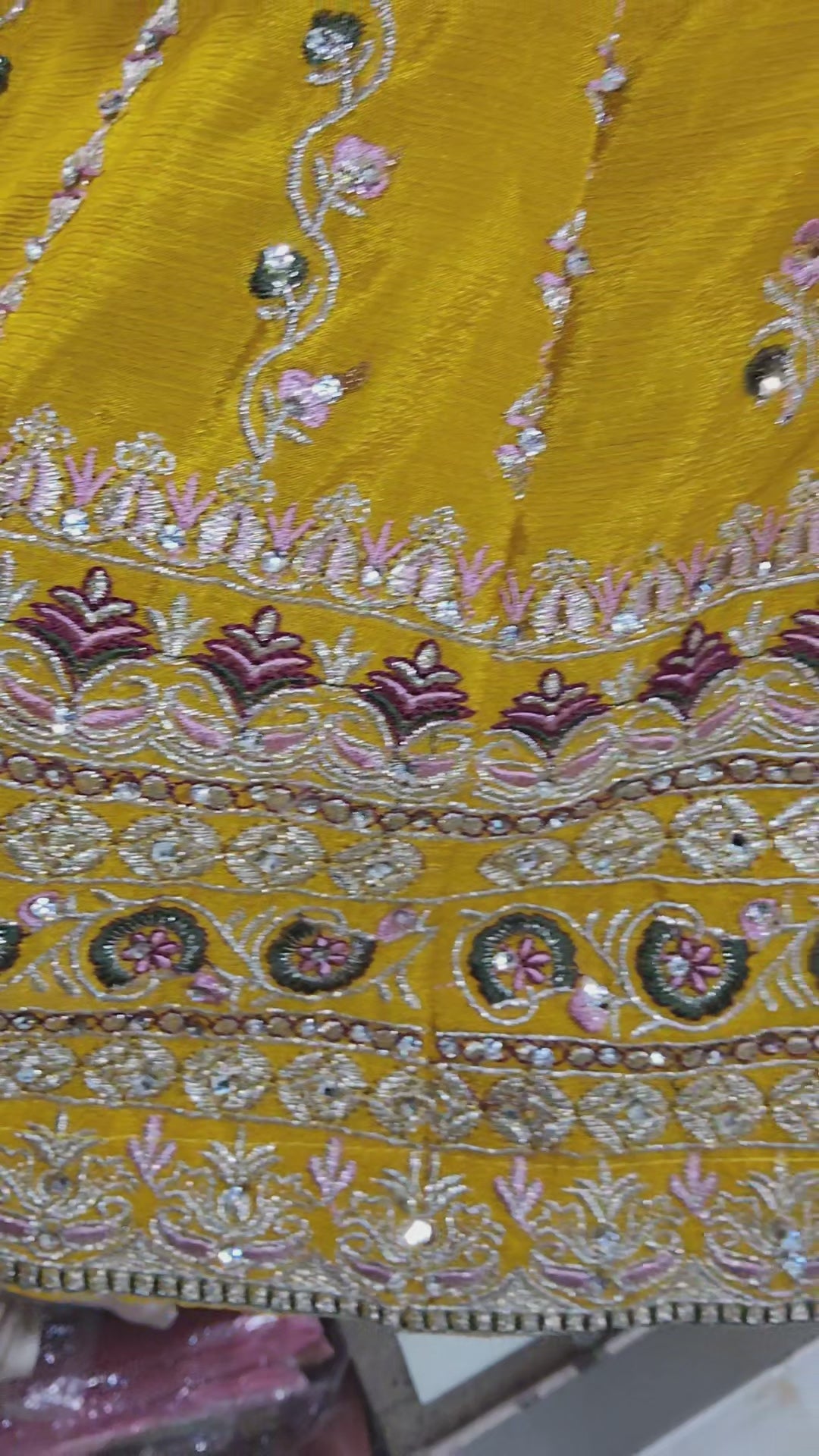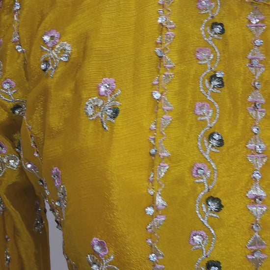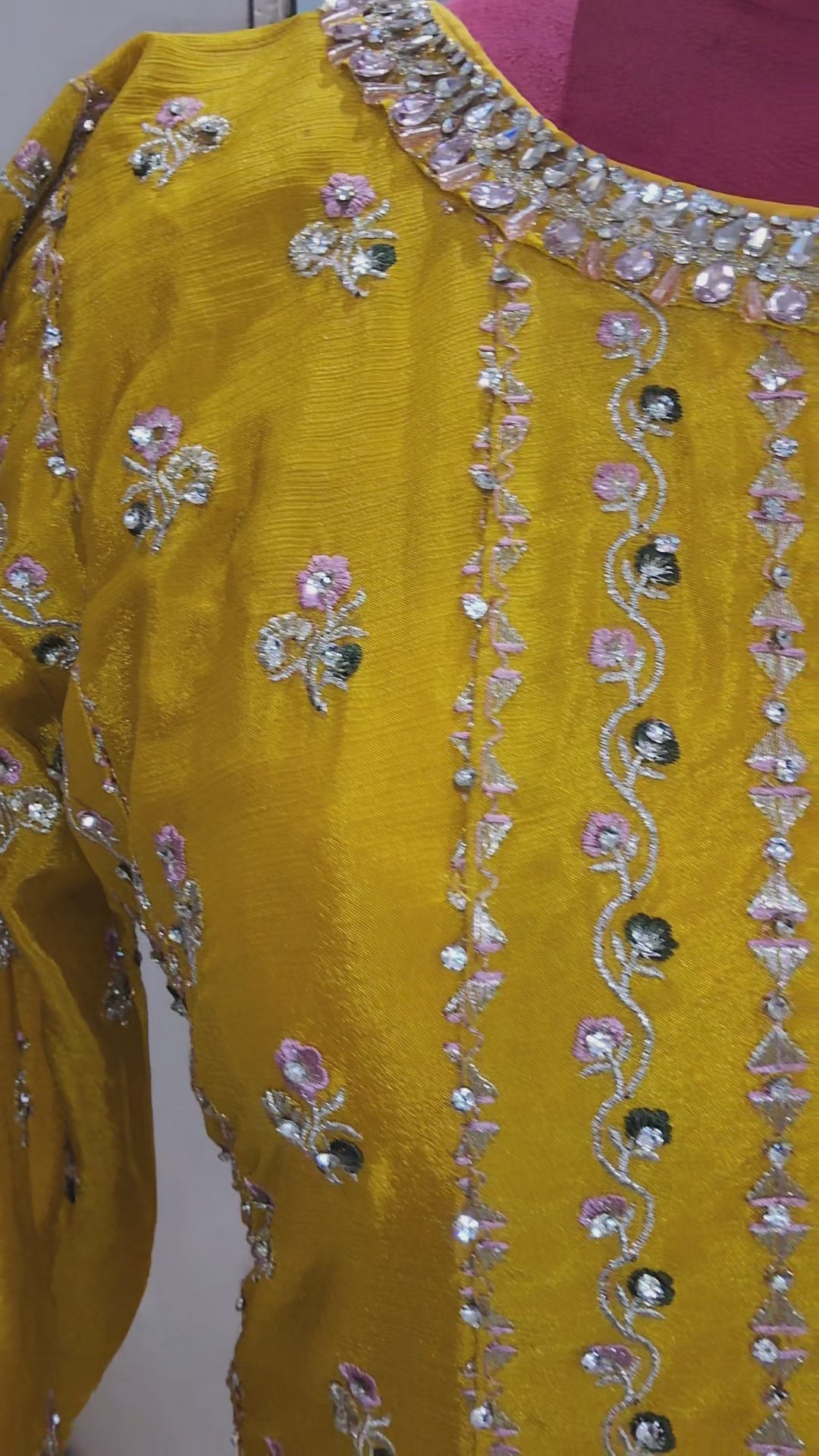 Elevate your style with our Mustard Sharara Suit. This elegant ensemble features a short anarkali with intricate thread embroidery and a flattering sharara bottom. You'll exude confidence and sophistication wherever you go. Stand out from the crowd with this unique and timeless piece.