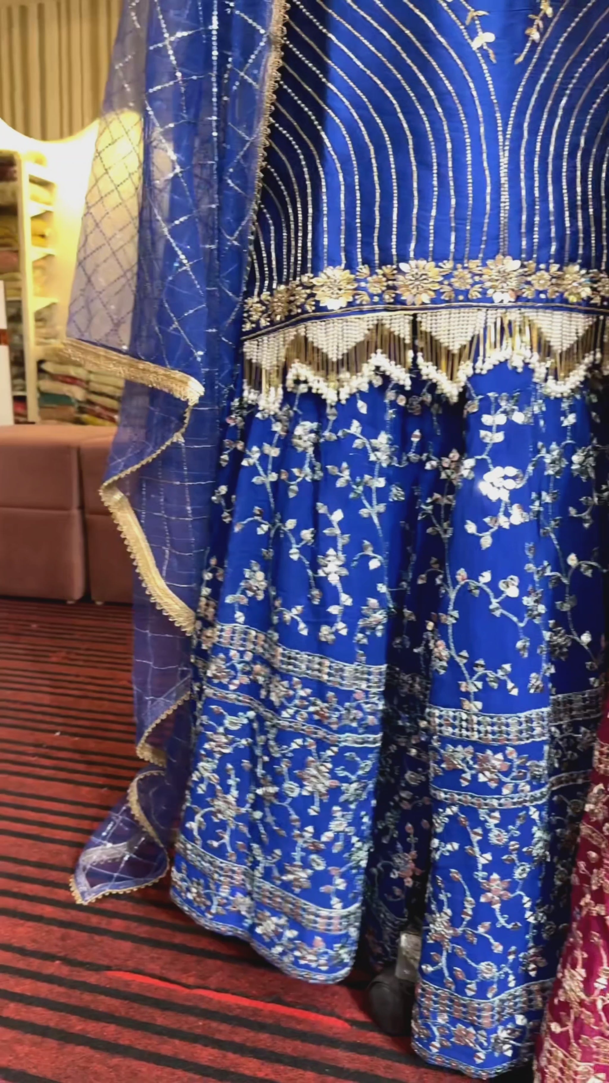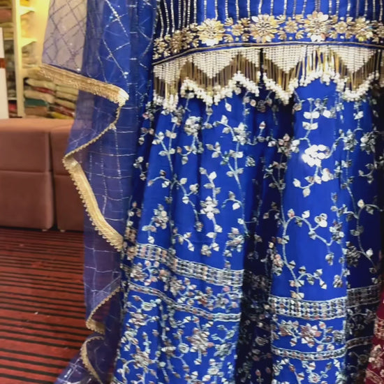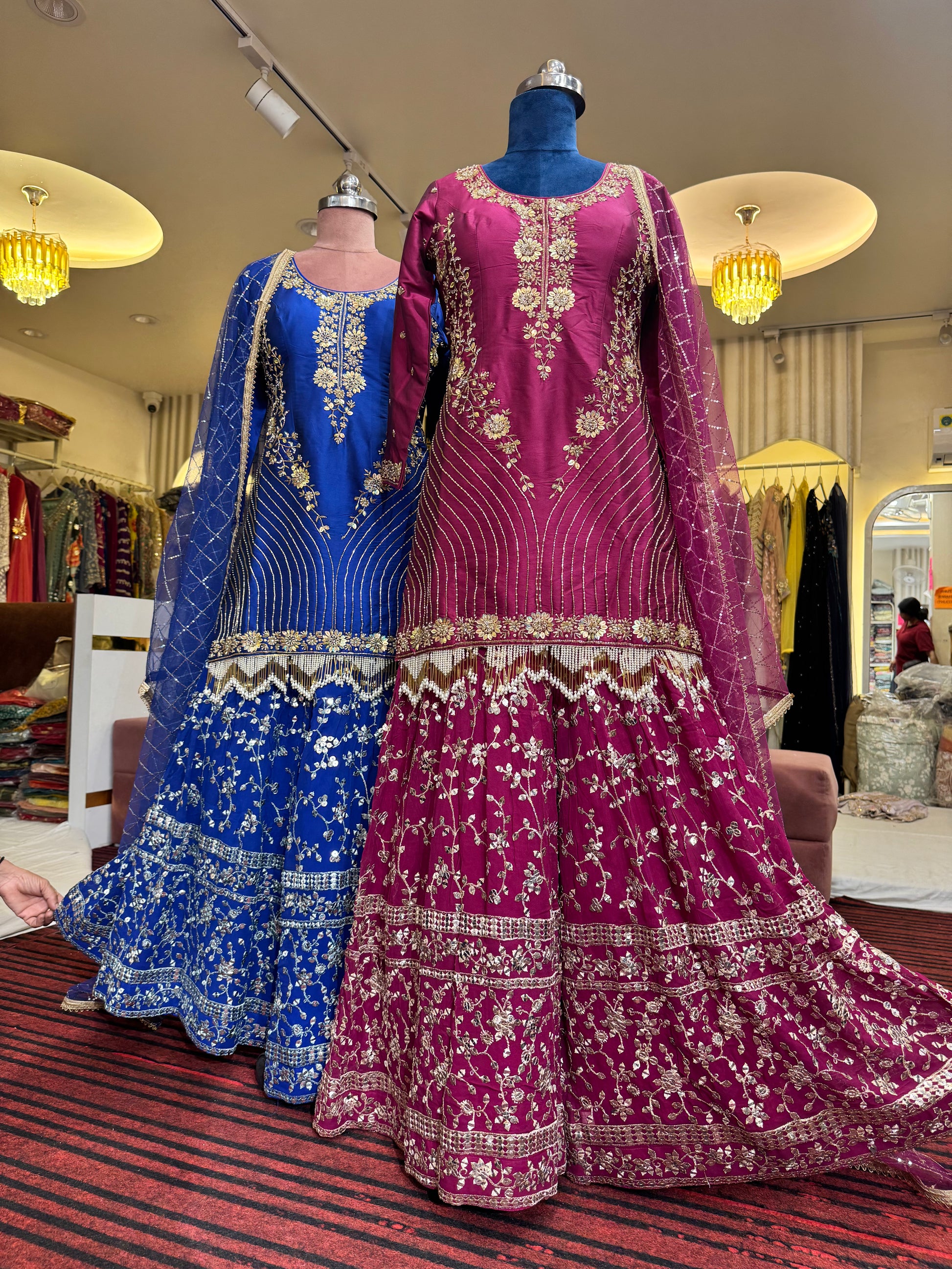 Expertly crafted for elegance and grace, our Sharara suit features intricate hand-embroidered designs on luxurious silk fabric. The beautiful net dupatta adds a touch of sophistication to this traditional ensemble. Elevate your style and make a statement with this stunning suit.