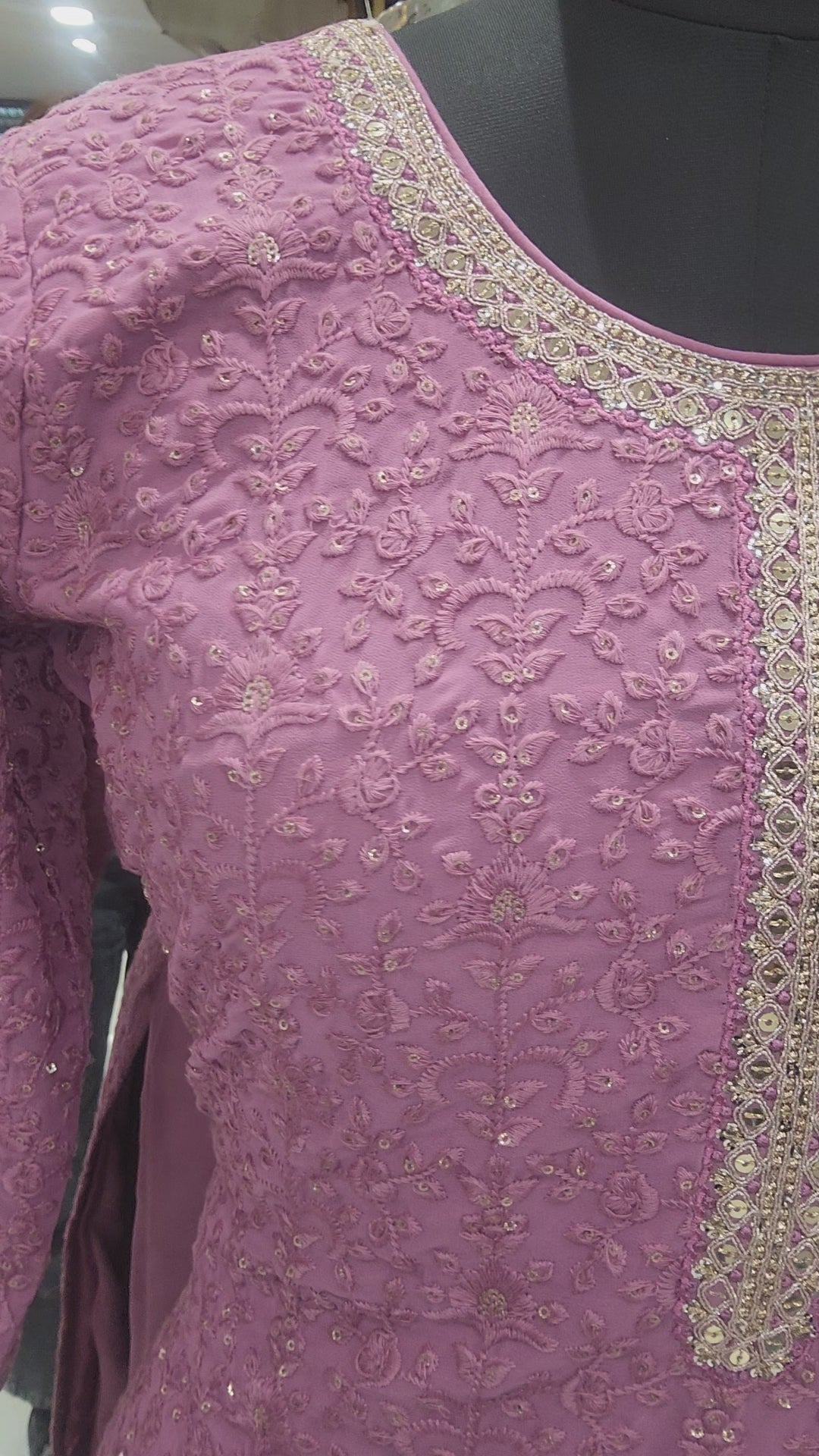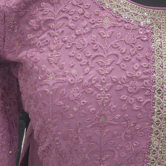 This Sharara suit features a beautiful neckline and intricate sequence work. Introducing our elegant lavender Sharara suit, featuring intricate thread embroidery inspired by traditional lakhnavi work with a touch of gold.