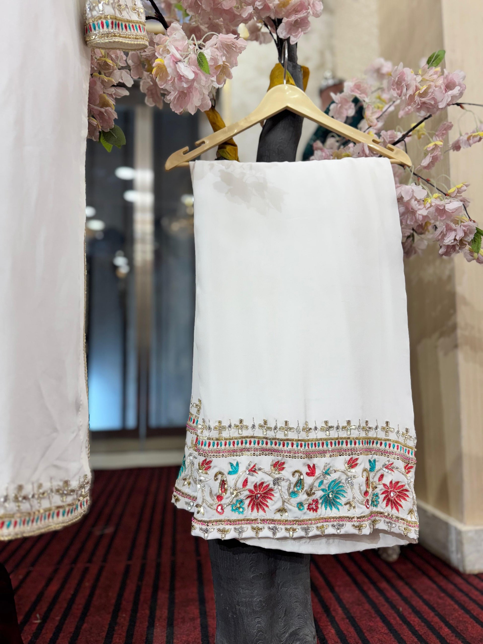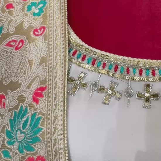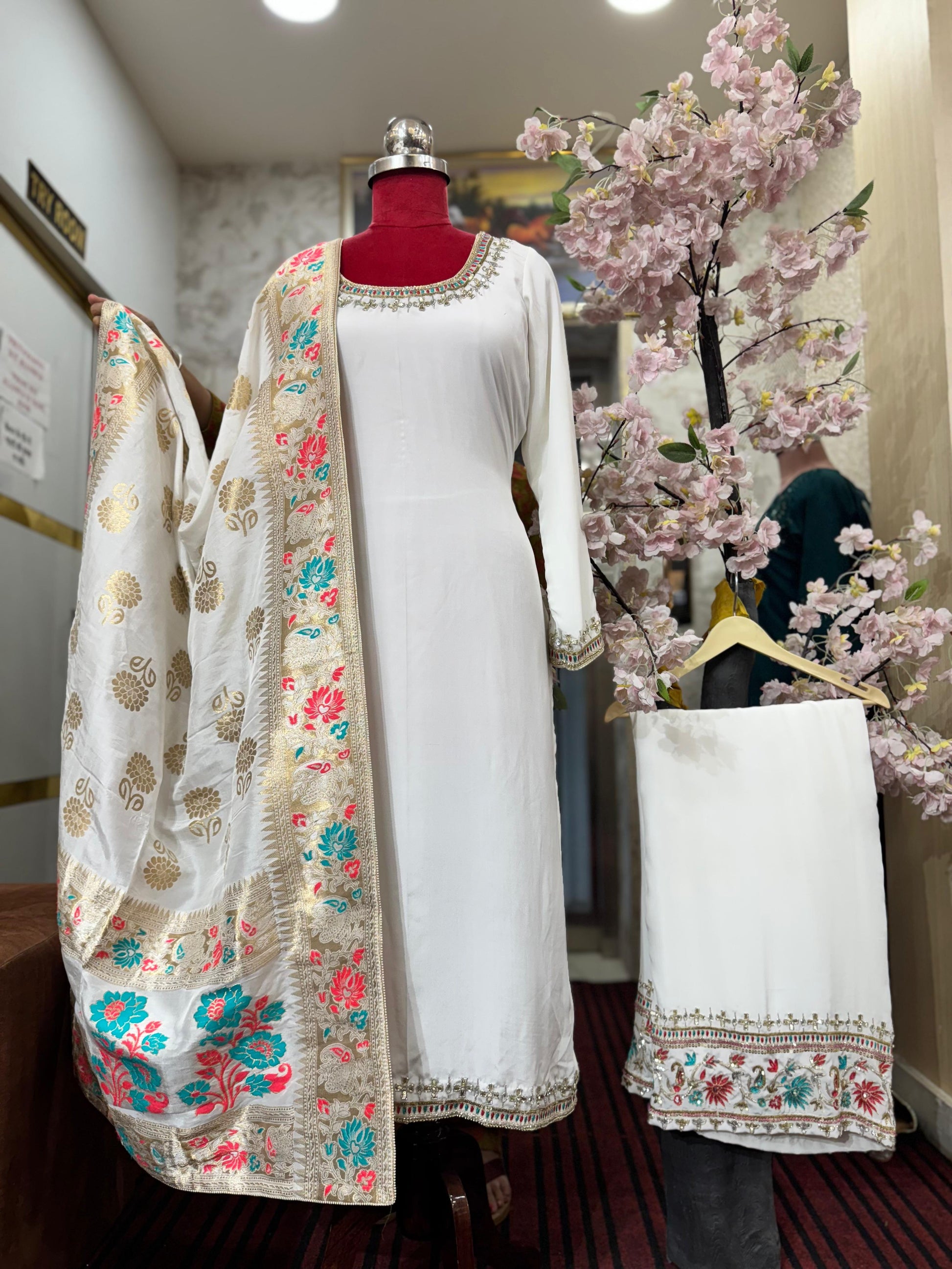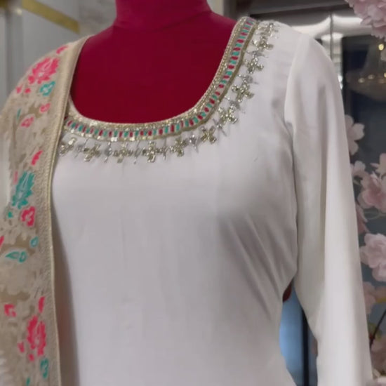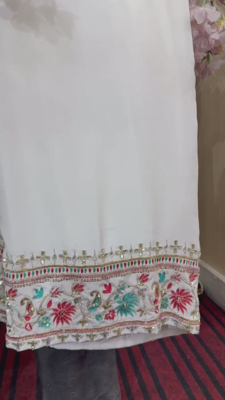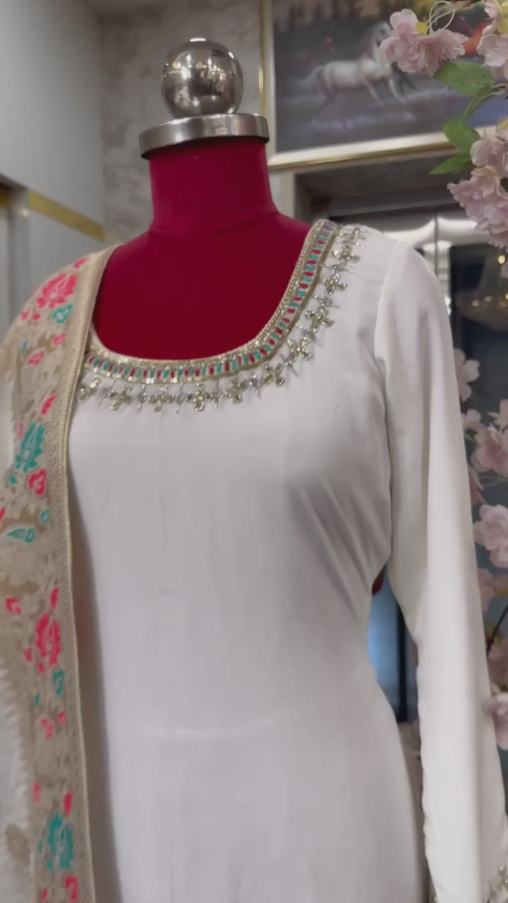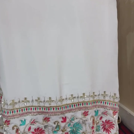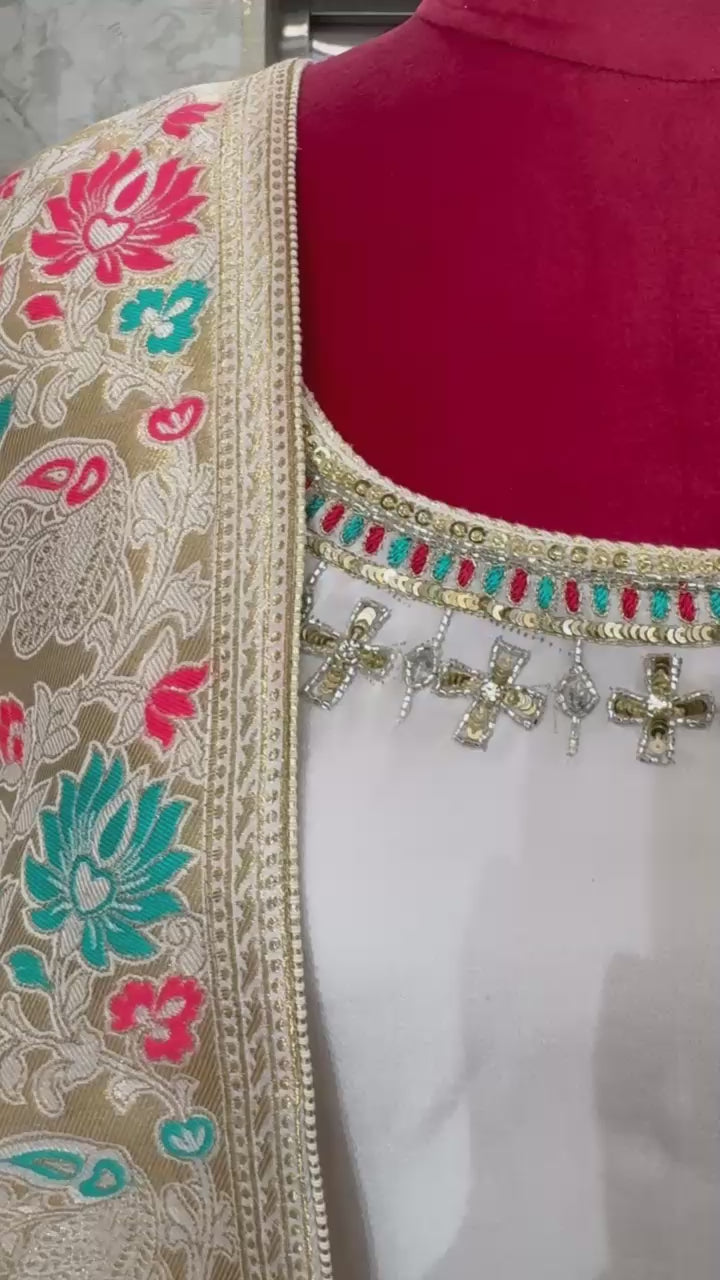 This white Straight Suit made with pure georgette fabric is elegantly designed with a Banarasi dupatta and colorful hand embroidery on the shirt and pant. Customizable in size and color, this suit offers a timeless and customizable option for a stylish and sophisticated look.